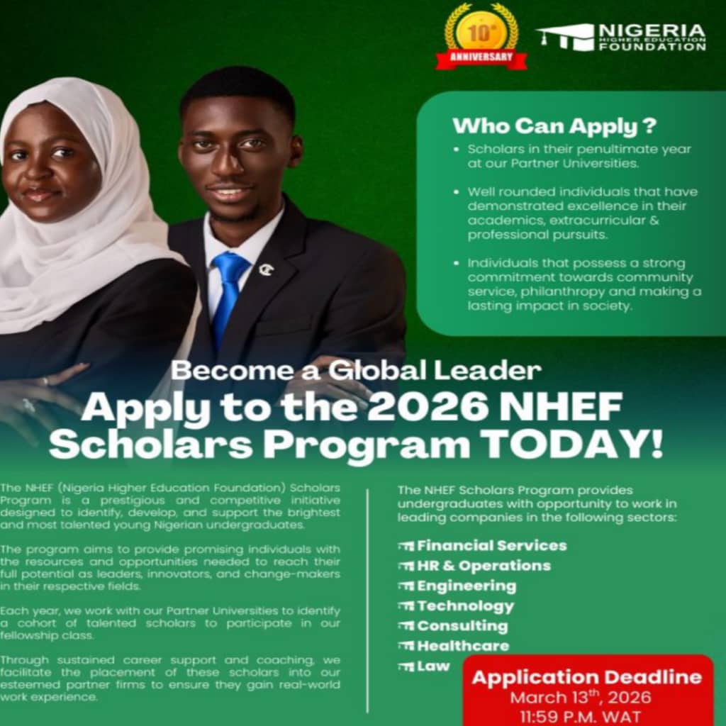 Calling All Nigerians: Applications Are Now Open for the 2026 NHEF Scholars Program:The Nigeria Higher Education Foundation has opened applications for the 2026 NHEF Scholars Program. This year marks ten years of continuous impact in building and supporting the next generation of Nigerian leaders across different fields.