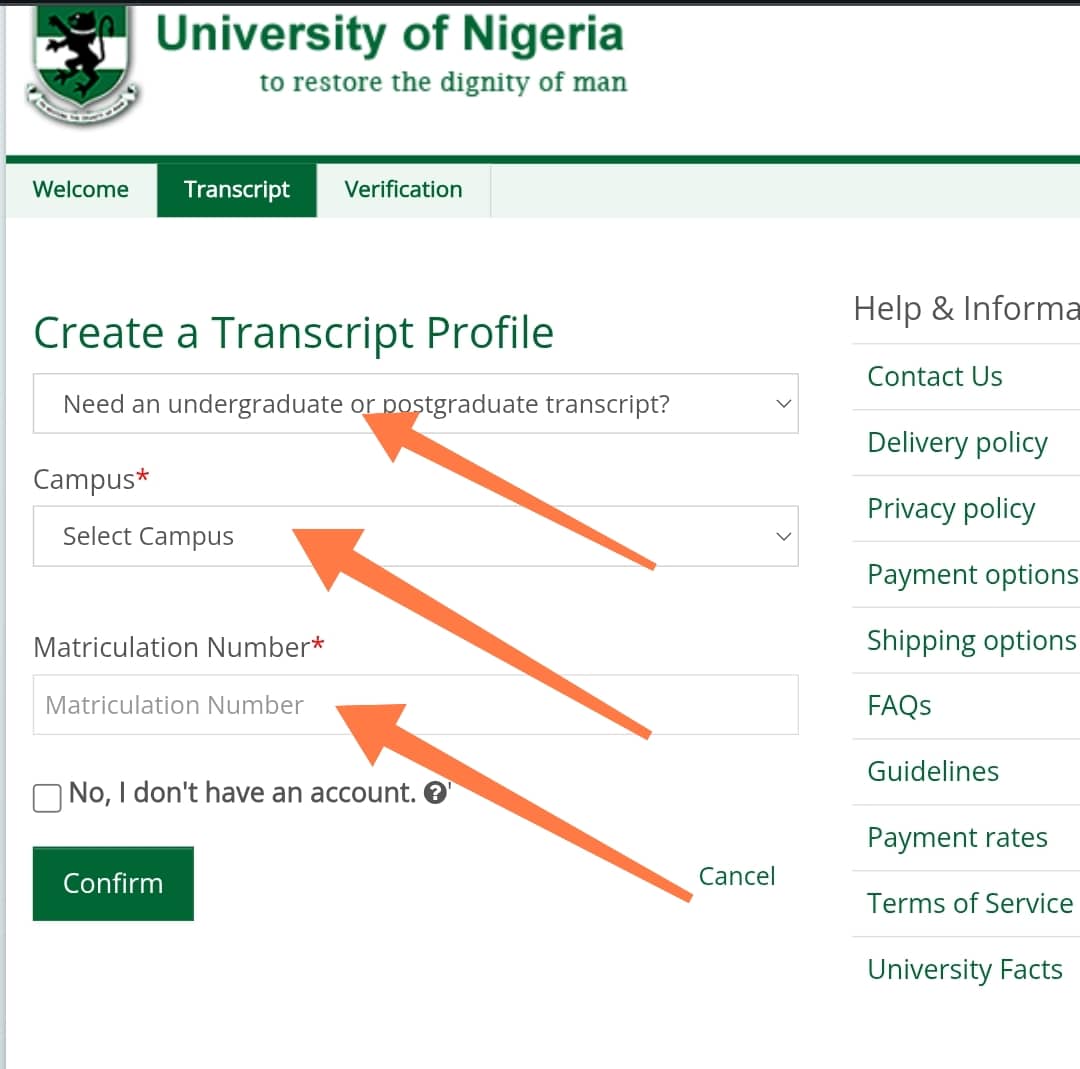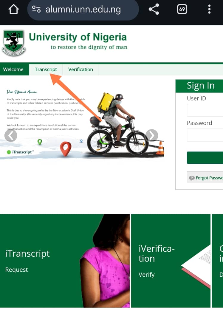Please take note, you are not to use any other link to apply, it must be the official UNN Transcript link.