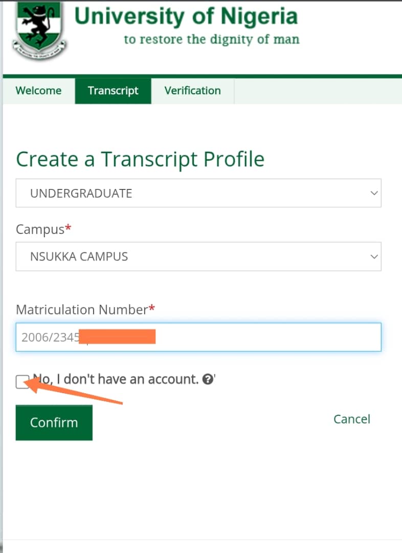 If you don’t have account before with the UNN Transcript, you are expected to click on the “No I don’t have an account” Box ☑️