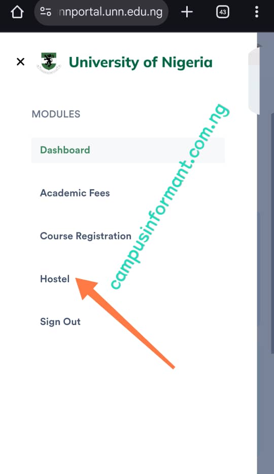 After you login successfully, click on the three dashes (menu icon) at the top left corner of your screen. Then scroll down. Immediately, you will see the Hostel option.