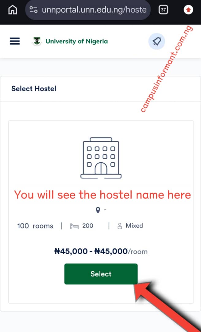 After that, the system will show the available postgraduate hostels. At this point, select any available option shown there. Sometimes only one hostel may appear. If that happens, it means that is the only available space for the University of Nigeria Nsukka (UNN & UNEC) post graduate hostel application at that time.
