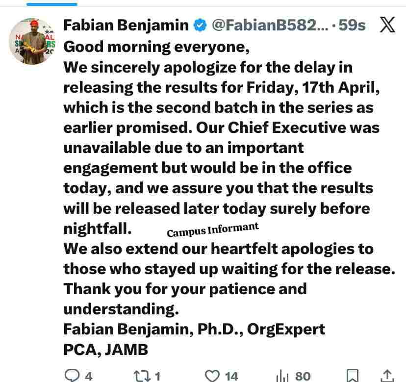 The board, however, assured candidates that the results for Friday, 17th April 2026, which represent the second batch of released results, will be made available later today before nightfall.