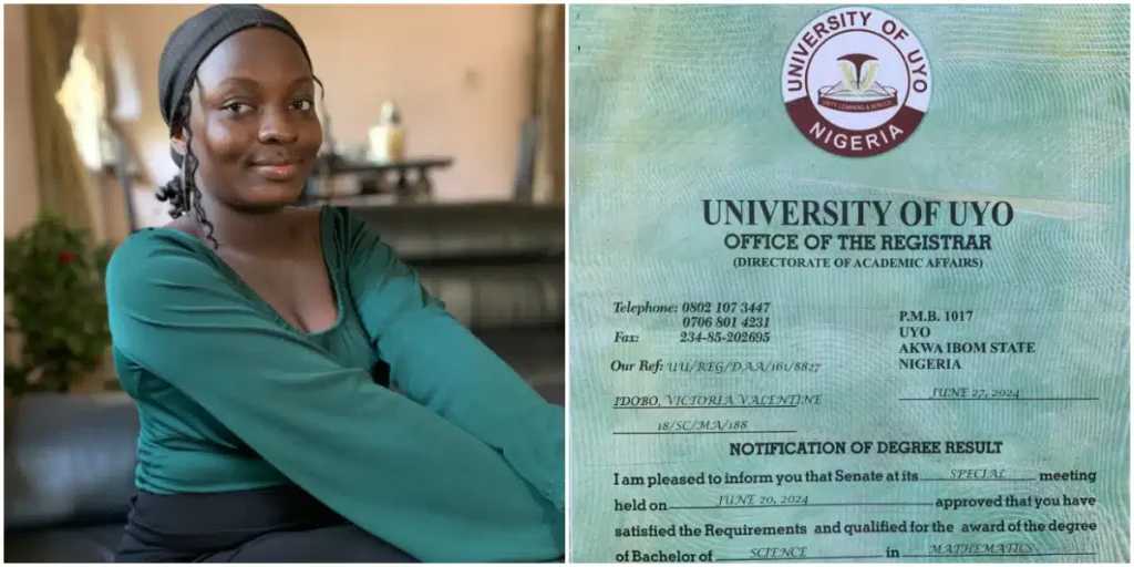 Nigerian Lady Stuns Many as She Achieves First-Class Honors in Mathematics: A Nigerian lady has garnered admiration online after earning a first-class degree in mathematics from the University of Uyo (UNIUYO). The graduate, Victoria Idobo, …