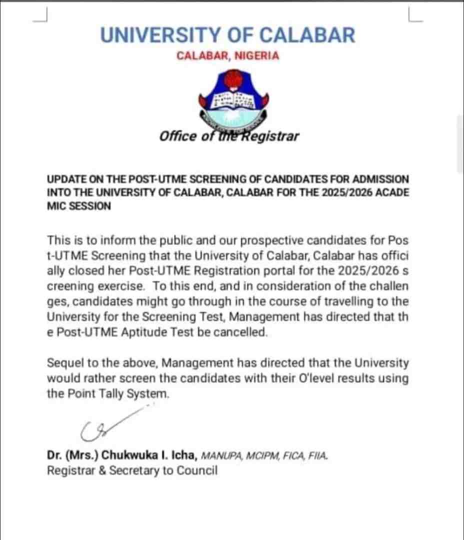 That’s the full update on UNICAL Post-UTME 2025/2026. Admission will be decided through O’level screening with the Point Tally System.