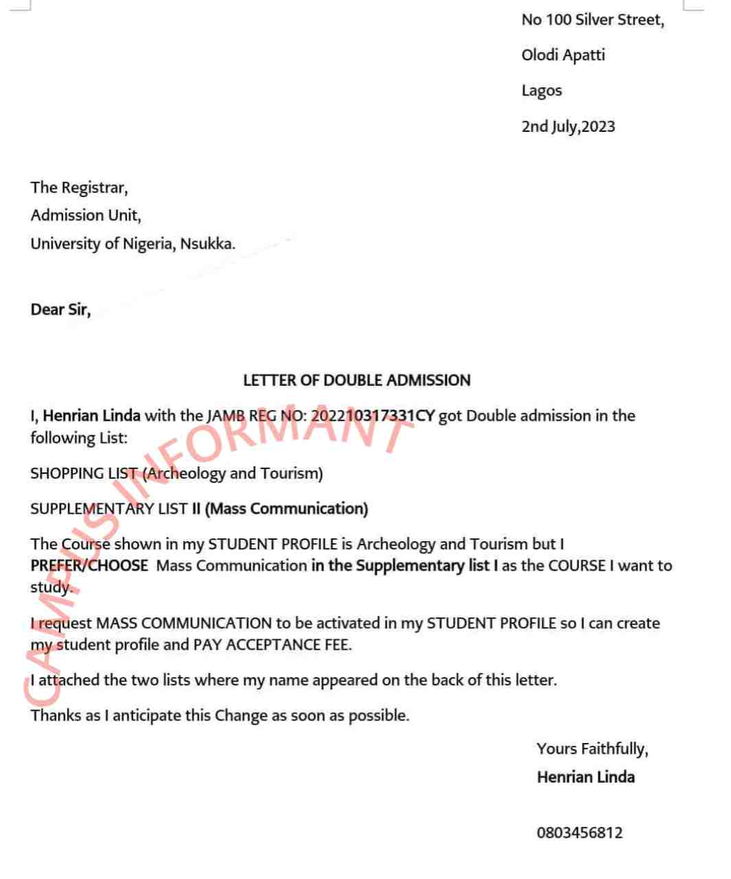 Sample of UNN Double admission letter