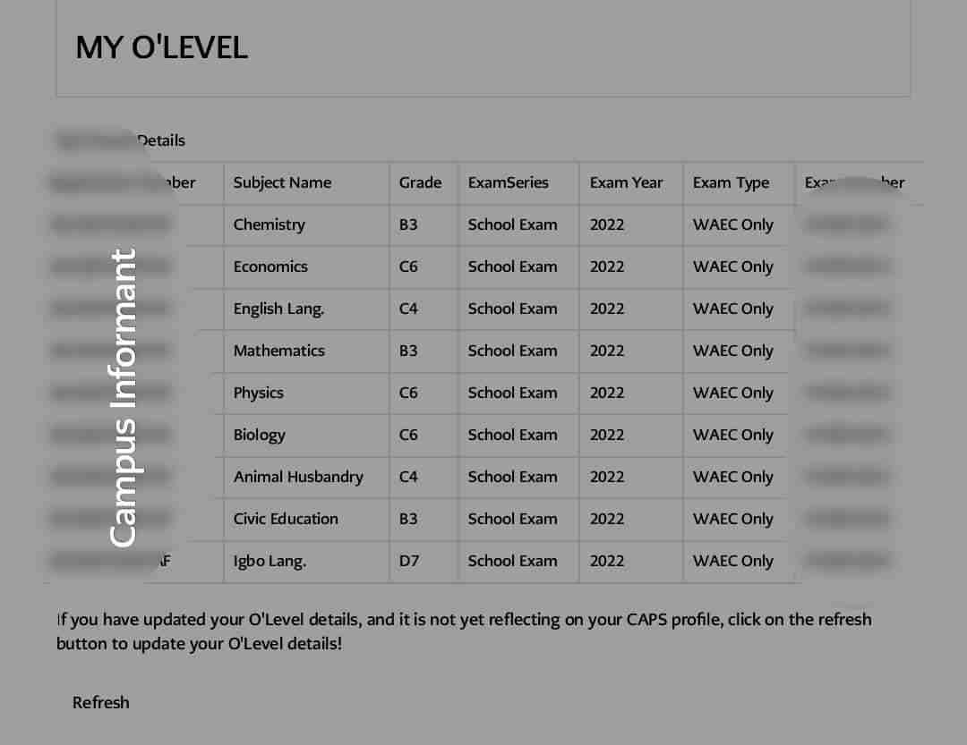 You can click on the refresh to be sure that your O’level Result hasn’t been uploaded or has been uploaded.