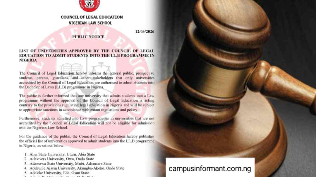 The Council of Legal Education serves as the statutory body responsible for the professional training and regulation of aspiring lawyers in Nigeria. Established under the Legal Education Act, the council supervises the Nigerian Law School and ensures that approved institutions maintain the required standards for legal education across the country. So at least for the academic session 2026/2027 this list serves as a directives to all candidates in Nigeria that wants to apply for law in the University.
