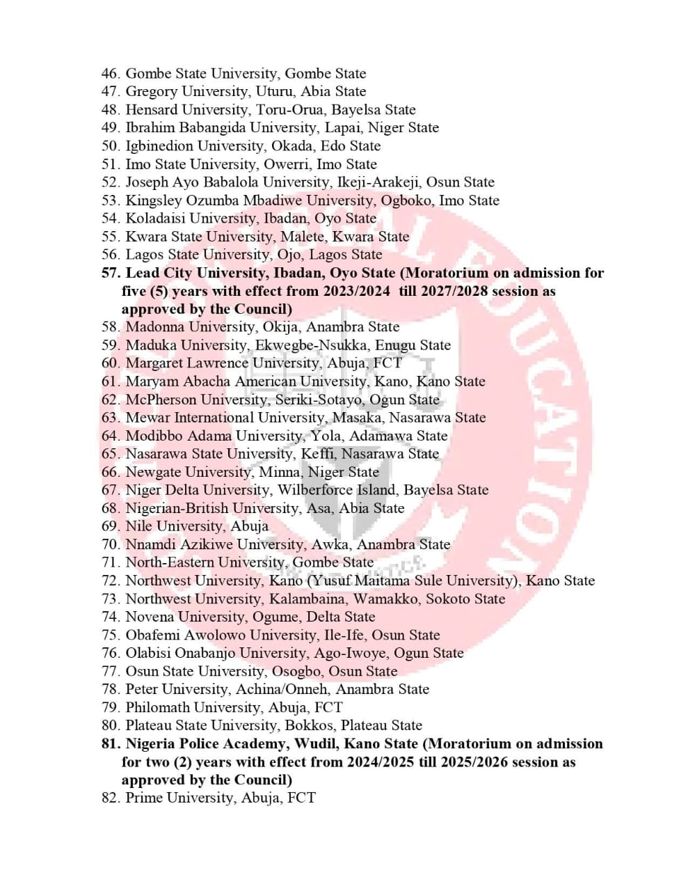 - Lead City University, Ibadan (Moratorium on admission for five years from 2023/2024 to 2027/2028 session)